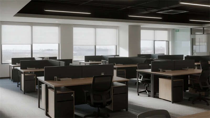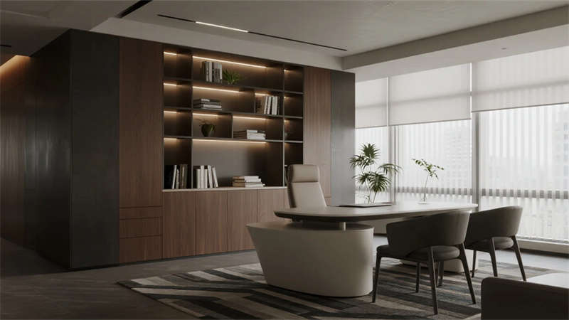 開放辦公區依托巨幅落地窗引入自然韻律,升降工位與模塊化家具賦予空間彈性;獨立辦公室通過垂直百葉調節光影私密性,暗藏式書柜燈光烘托沉穩氣質。核心協作區打破傳統封閉模式,弧形沙發與可書寫玻璃墻激發即興創意,而茶水間綠植墻與城市景觀吧臺,則在高效節奏中注入呼吸感。