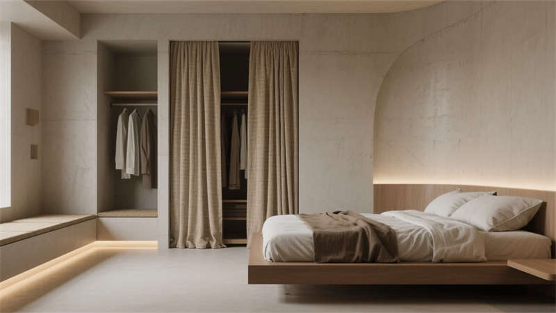 衛(wèi)浴空間化身立體水景容器,鏡面天花反射青石浴缸與垂吊綠植,形成虛實交織的自然劇場。所有構(gòu)件皆服務(wù)于居者與環(huán)境的對話,混凝土墻體在晨昏光線中呈現(xiàn)不同肌理,定制家具的圓弧收邊柔化現(xiàn)代主義的冷冽。