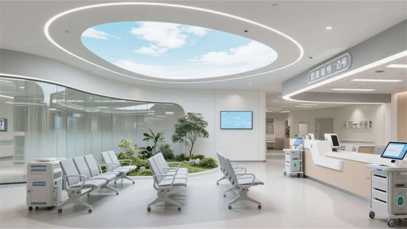 智慧系統(tǒng)隱形滲透每個(gè)角落:候診區(qū)的生態(tài)墻內(nèi)嵌電子叫號屏,醫(yī)療街導(dǎo)航立柱實(shí)時(shí)更新就診信息,病房床頭屏集成環(huán)境控制與醫(yī)療呼叫功能。特別設(shè)計(jì)的抗菌材質(zhì)與無縫工藝,在營造溫暖氛圍的同時(shí)嚴(yán)守院感防線。